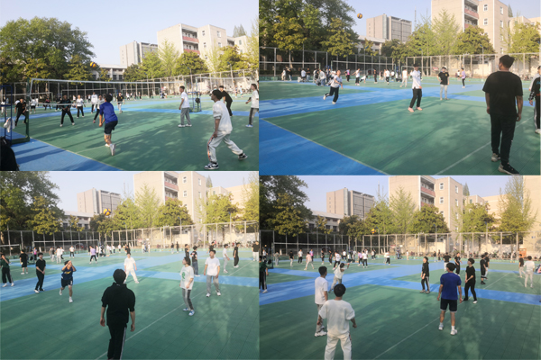 未开赛之前,气氛都已相当紧张激烈,“战争”一触即发,各班同学聚集在赛场周围翘首以待。比赛一开始,双方就势均力敌,各施绝技,难分上下,一个个精彩扣球、拦网,队员们互相配合,相互鼓励,团结拼搏,为大家奉献了一场精彩绝伦的比赛,让在场的观众欢呼不已。特别是两位来自学院排球队的女队员,在球场上更是飒爽英姿,博得观众的阵阵喝彩。