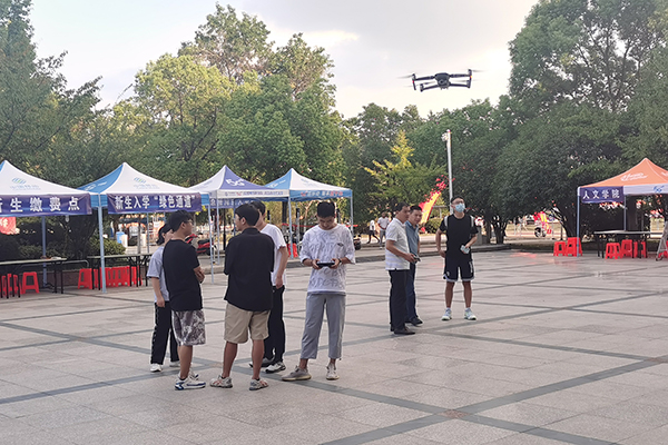 张程对现场作品摆放位置以及展品选择做出具体指导,同时还要求参展作品要确保安全、不能妨碍新生报到秩序,同时还要充分展现机械学院工学特色。张华指导学生现场调试工作,通过计算机操作让智能无线遥控视频车在迎新场地上行进、旋转、倒行、播放视频,确保展品在新生报到当天正常运行。
