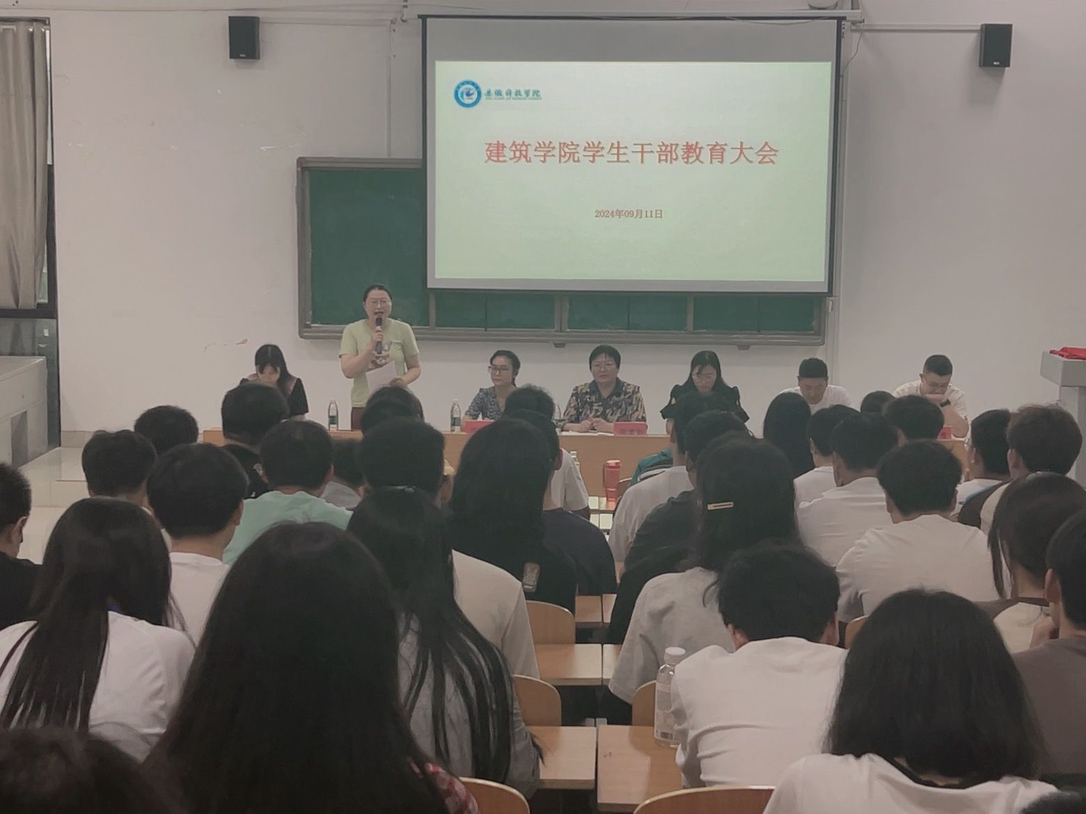 新学期,新征程,新目标。9月11日下午,建筑学院在敏行楼C102召开了新学期学生干部教育大会。学院党委副书记谢宜勤、全体辅导员、全体学生组织成员及各班级主要学生干部参加。会议由学院党政办主任靳盼主持。
