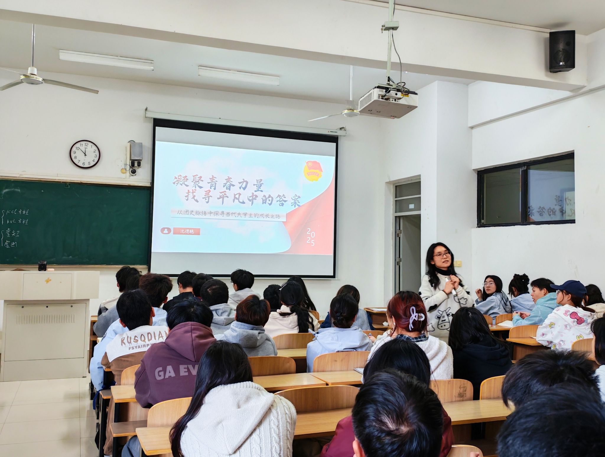 沈德艳以电影《志愿军:浴血和平》的群像叙事开篇,带领同学们回溯共青团百年奋斗历程。在烽火年代,匡互生奋勇闯入曹公馆,点燃五四运动觉醒的火种;中共一大平均年龄仅28岁的代表,在黑暗沉沉的旧中国擎起信仰的旗帜。建设时期,杨华率队奔赴北大荒,在严寒荒原上开垦希望的田野;雷锋以“出差一千里,好事做了一火车”的点滴善举,诠释了平凡中的伟大。改革春潮中,小岗村18位农民按下“红手印”,拉开农村改革序幕;新疆柯柯牙上百万人历时30年义务植树,将荒漠变为百万亩林海,书写了生态治理的绿色奇迹。一个个平凡青年的身影,汇聚成推动时代前行的青春洪流。