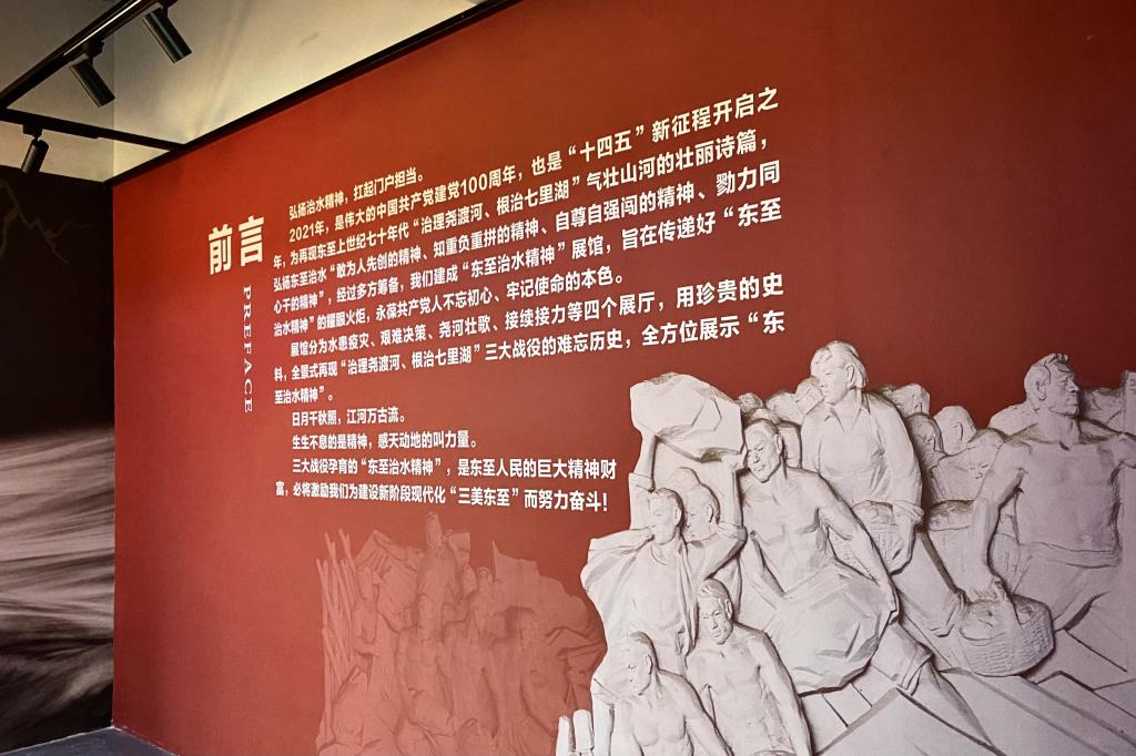 东至治水精神纪念馆主要分为“水患疫灾”“艰难决策”“尧河壮歌”“接续接力”四部分,展示了上世纪70年代,为根治东至尧渡河流域水患虫疫,全县干部群众历时五年,打响“三大战役”,治理尧渡河,根治七里湖,防洪灭螺,确保河湖安澜、群众安居乐业的故事。它创造出新中国防洪灭螺的典范,是中国共产党精神谱系的重要组成部分,是中国共产党带领人民克服水患虫疫,创造幸福生活的光辉典范。团队成员在讲解员的带领下,通过珍贵的文物实物、详实的档案资料、生动的图片视频、逼真的复原景观,全方位感受了东至治水精神,深刻把握了东至宝贵“治水精神”的内涵。