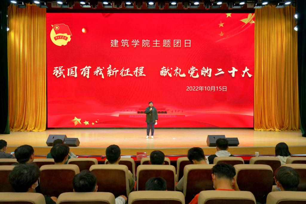 10月15日,建筑学院在图书馆东辅楼二楼报告厅开展“强国有我新征程 献礼党的二十大”主题团日。建筑学院党委书记傅友福,党委副书记谢宜勤、团委书记沈德艳,团学干部,2022年受到团内表彰的先进集体和优秀个人代表,以及2022级全体新生参加活动。