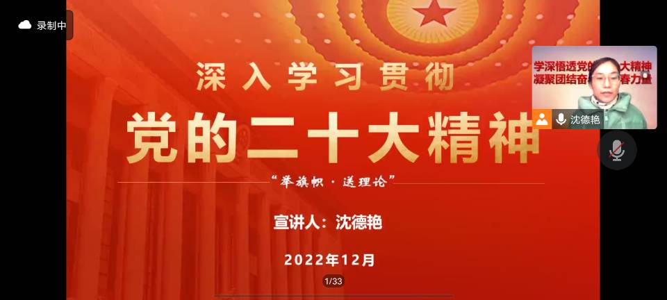 12月19日下午,校辅导员理论宣讲团成员、建筑学院团委书记沈德艳线上为学院学生党员、团学干部、班级干部、青马学员开展了深入学习贯彻党的二十大精神理论宣讲。