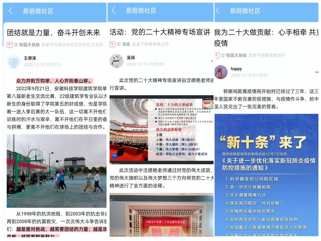 宣讲后,班级依托易班网络平台,陆续开展“我为党的二十大做贡献”线上接力活动,进一步推动党的二十大精神入脑入心,走深走实。