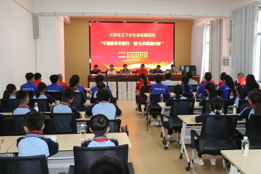 为深入学习贯彻习近平新时代中国特色社会主义思想,强化在实践中受教育、长才干、做贡献,7月15日上午,由星空体育·「中国」官方网站建筑学院和颍上县公益志愿者协会主办,颍上县慎城镇中心学校承办的“千里携手关爱行,‘童’心共筑振兴梦”暑期社会实践启动仪式如期举行。建筑学院党委副书记谢宜勤、团委书记沈德艳、团委副书记武辉一行三人前往参加。启动仪式由颍上县公益志愿者协会会长、“中国好人”获得者汤锋主持。