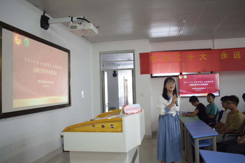 2022年安徽省优秀共青团员刘馨怡以《接力精神火炬,筑梦星辰大海》为主题,带领学生深入学习了习近平总书记给中国农业大学科技小院的同学们回信中充分肯定的“自找苦吃”的精神。宣讲由视频《立鸿鹄志做奋斗者——习近平对青年的殷殷嘱托》开场,围绕“追梦”、“担当”、“奋斗”三个关键词,列举了一系列榜样人物、先进事例,并结合自身在暑期返家乡开展社会实践活动取得的成果,向大家宣讲了“自找苦吃”精神的深刻内涵,希望大家以理想为风帆,以担当为使命,以奋斗为标杆,在“自找苦吃”中收获大有可为之“甘甜”。在讨论交流环节,刘馨怡围绕如何开展社会实践和更好学习专业知识学习两方面进行了经验分享,鼓励团员青年将自己所学的专业知识合理运用起来,为乡村振兴工作贡献青春力量。