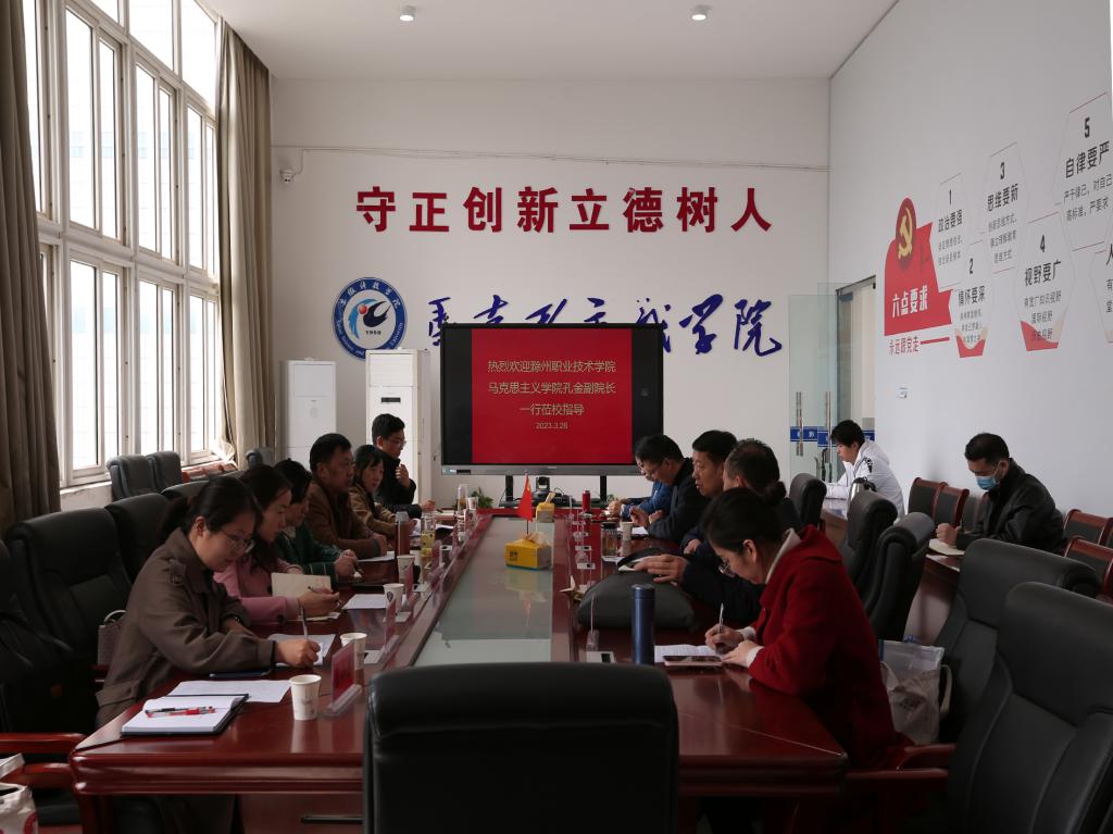3月26日上午,滁州职业技术学院马克思主义学院院长孔金一行来我校马克思主义学院调研交流。会议由我校马克思主义学院院长张德化主持,学院党总支书记杨仕勇、副院长张栋及教研室主任、骨干教师参加座谈交流。