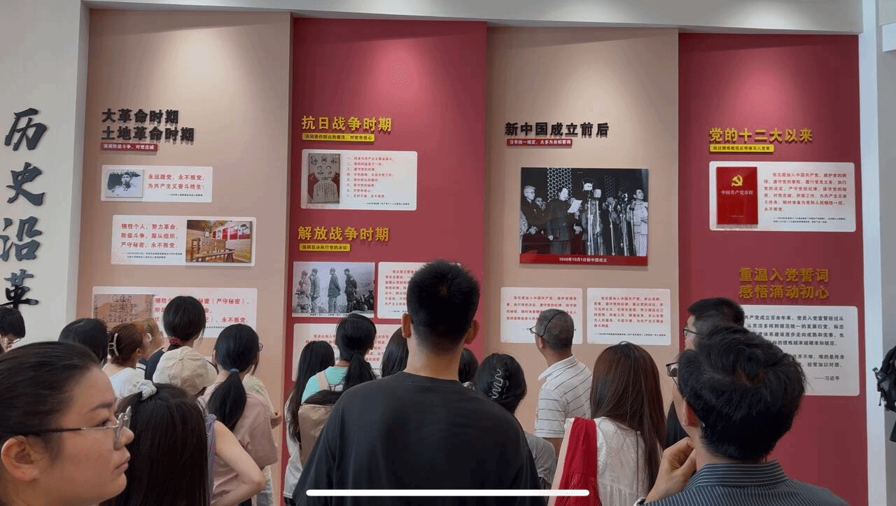 下午,参观了禾泉党史馆。馆内陈列分为中国共产党史、蚌埠革命史、共青团史、少先队史和统一战线五大部分。在李红艳老师引导下,同学们依次参观各个展厅——从南湖红船启程到党的二十大胜利召开,展览生动再现了党的百年奋斗历程,彰显了中国共产党不畏牺牲、英勇奋斗的精神品质。特别是开国大典上毛泽东主席发言的彩色影像,与近期举办的纪念抗战胜利80周年阅兵仪式形成强烈对比,使同学们深切感受到在党的全面领导下国家日益强盛的伟大历程。