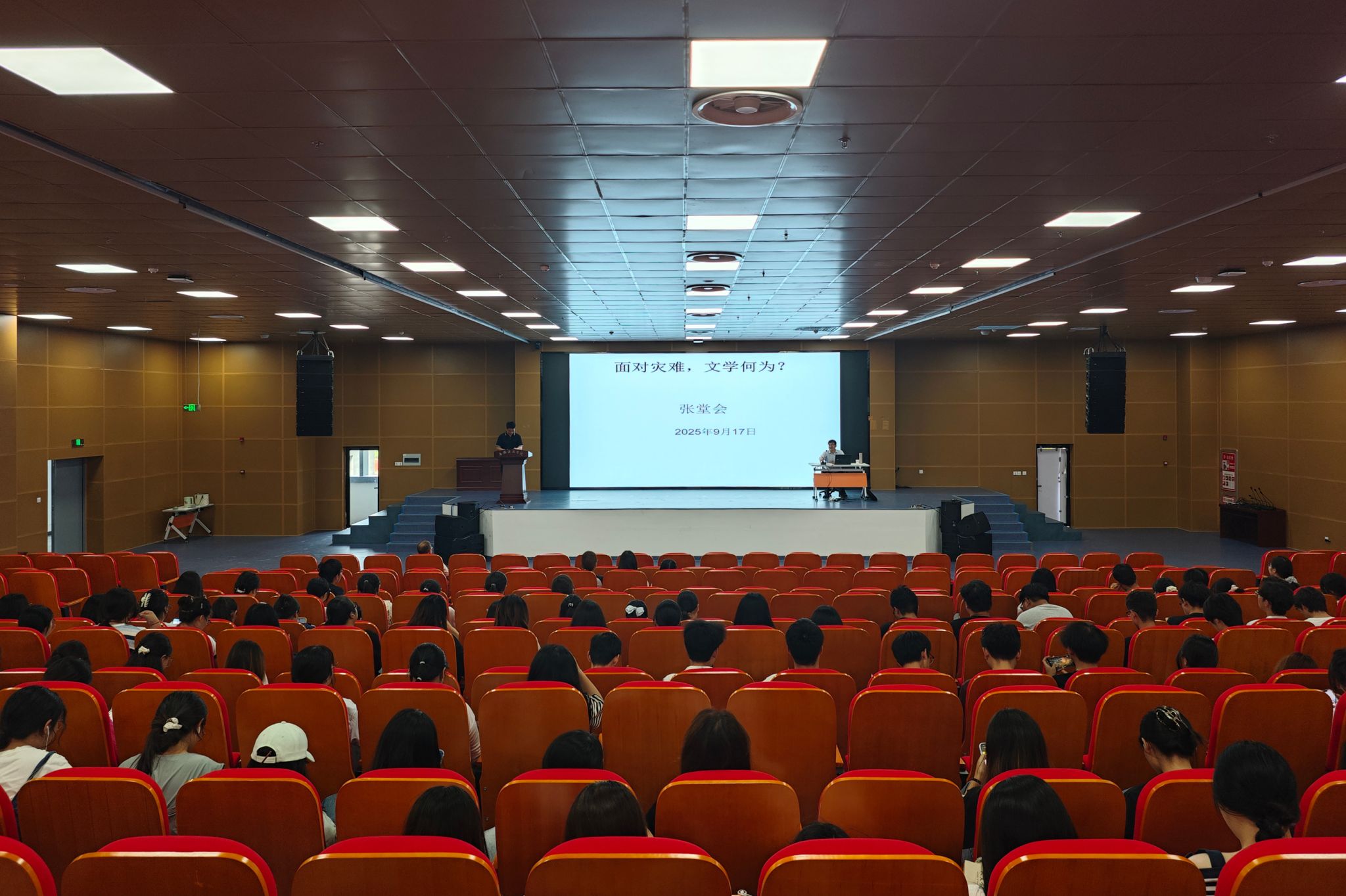 9月17日下午,人文学院邀请扬州大学文学院张堂会教授来校作“面对灾难,文学何为”学术报告。汉语言文学专业2023、2024级全体学生参加,报告会由人文学院副院长牛永辉主持。
