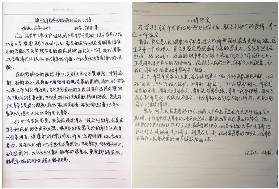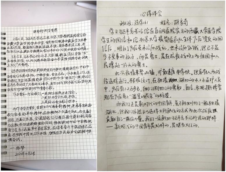 法学学生党支部成员王慧如结合学习内容以及“两封回信”表示,疫病无情人有情,疫情暴发后,各类人士用自己的方式为战“疫”贡献力量;学校则第一时间启动对学生本人、共同生活家庭成员患新冠肺炎的学生和现居住在湖北的家庭经济困难学生以及其他地区困难学生的逐一排查,每日进行动态跟踪管理。作为一名青年党员自然不能置身事外,我们也应积极发挥先锋模范作用,为打赢抗疫阻击战尽绵薄之力。