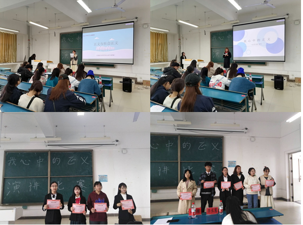 为了丰富学生的课外生活,培养其运用法律知识的能力,感受法律魅力,11月15日,人文学院于新知楼B303教室举办了“我心中的正义”主题演讲比赛,校英语协会副会长陆蝶、校演讲与口才协会秘书部部长高欣、校菁英主持社组织部部长赵澜琼、校新媒体中心广播台播音员齐长慧担任此次比赛评委。