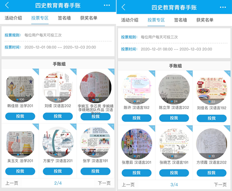 活动前,举办方通过人文学院学生会官方QQ发布动态进行宣传,向学生们广泛征集有关“四史教育”的优质手帐作品,鼓励学生们通过新颖的素材记述自己与“四史”的故事,分享自身学习感受,传递正能量,展现青年大学生的精神风貌。活动期间,各班学生积极踊跃参与,举办方收到了大量有趣、新颖、幽默的作品,学生们纷纷用自己独特的方式记录下自己的学习感受,极大的丰富了活动意义。最终经过为期三天的投票评选,汉语言191班的黄子怡、黄娟、季艳、霍雨涵团队及汉语言192班的刘淇获得了本次比赛的一等奖,汉语言191班的石鑫宇、徐静团队、法学202班的齐梦圆、荣煜团队和法学202班的刘亦涵荣获二等奖,汉语言192班的周臻、张颖团队、法学201班的韩佳丽与汉语言202班的刘续获得三等奖,其余若干同学获得优秀奖。