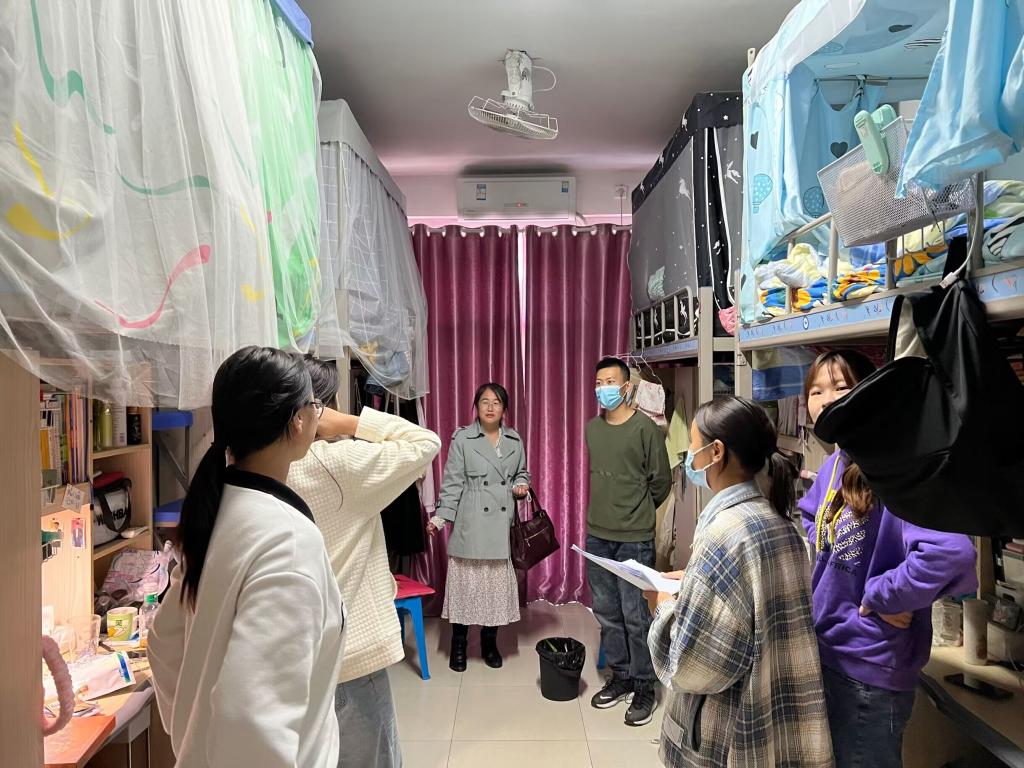 两人先后进入学生寝室,亲切地向同学们问好,了解其生活学习状况,希望同学们提高安全防范意识,加强日常交流,创造浓厚的学习氛围。李沙娜希望同学们认真备考,加强复习力度,相互监督,保证按时按质完成课程考核任务。在了解了宿舍生活情况之后,李沙娜询问同学们日常生活中遇到的问题并给予生活建议,同时对寝室卫生进行检查。最后强调各寝室长务必落实好寝室安全管理制度,不得无故外宿,养成良好的作息习惯,争创文明宿舍、学习型宿舍。检查之后,老师叮嘱同学们一定要注意寝室安全,安全用电,同时注意保持寝室卫生整洁,并希望学生干部能够做好实践带头作用。