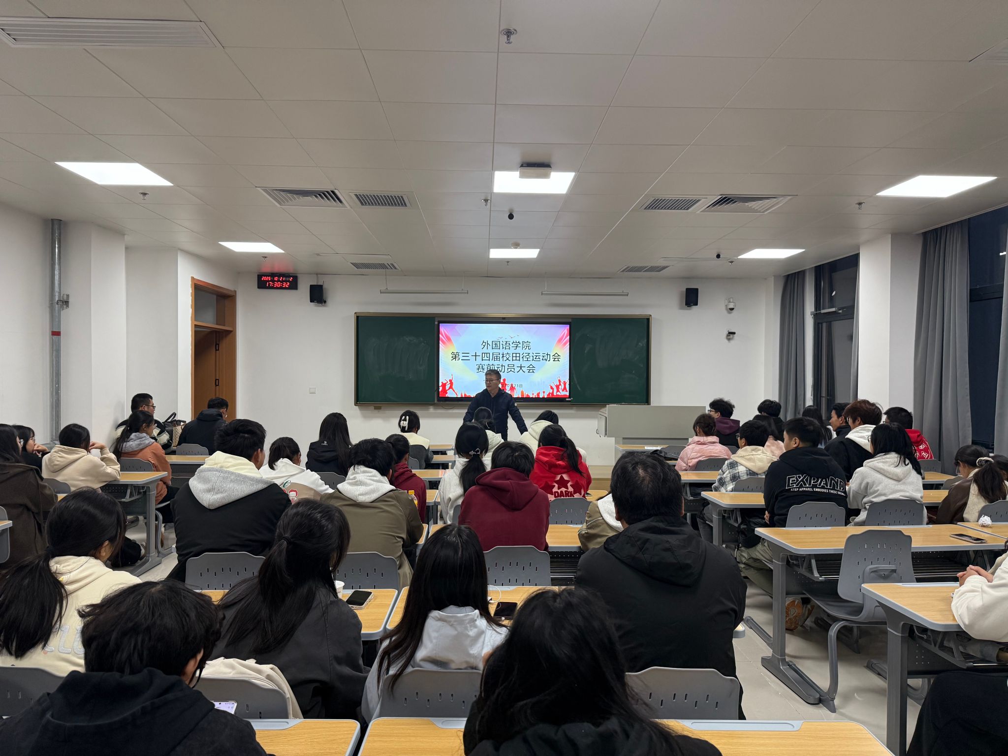 10月21日下午,外国语学院在学思楼5号楼104教室召开校第三十四届田径运动会赛前动员会。学院党委副书记张海亮出席会议,全体辅导员、参赛运动员、志愿者参会。