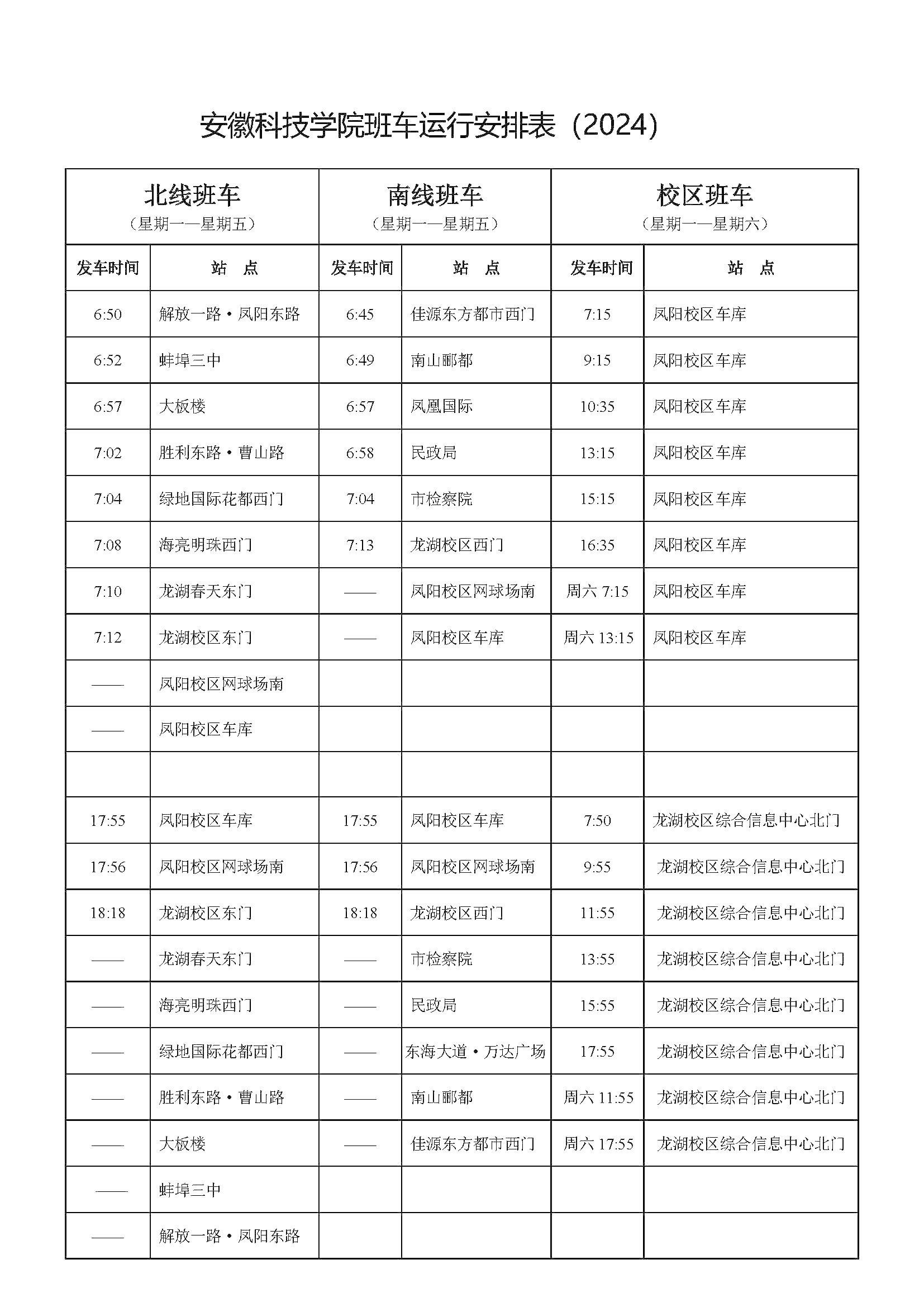 2.校区班车运行时间为:凤阳校区车库7:30、13:30;龙湖校区综合信息中心北门12:10、17:45。