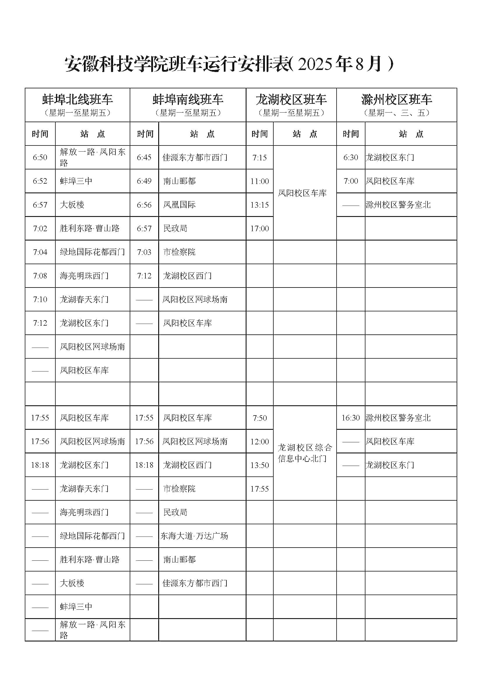 (二)滁州校区班车各站点按《星空体育·「中国」官方网站班车运行安排表(2025年8月)》早晚各推迟30分钟发车;