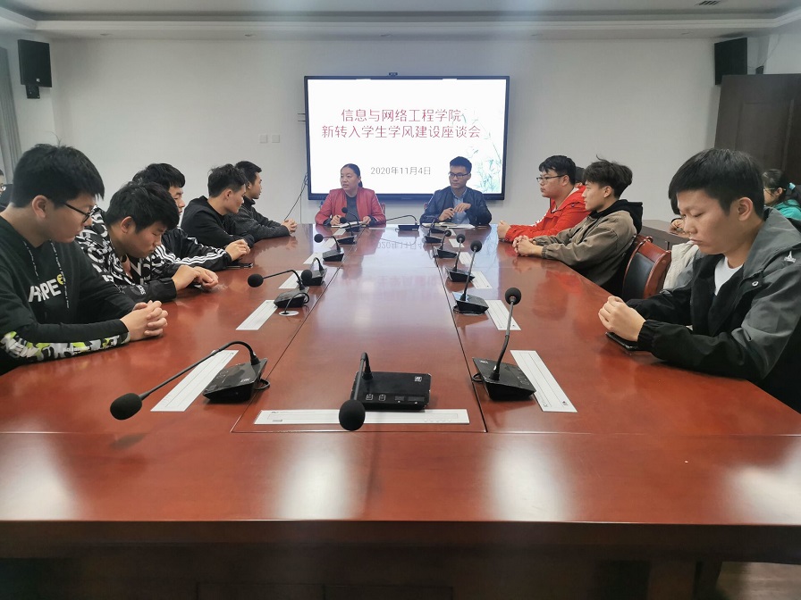 为进一步加强学院学风建设,全面了解新转入学生学习生活适应情况,11月4日下午,信息与网络工程学院在西辅楼416会议室召开新转入学生学风建设座谈会。副处级辅导员韦乃学、专职辅导员李军成及2019级新转入学生参加了本次会议,会议由韦乃学主持。
