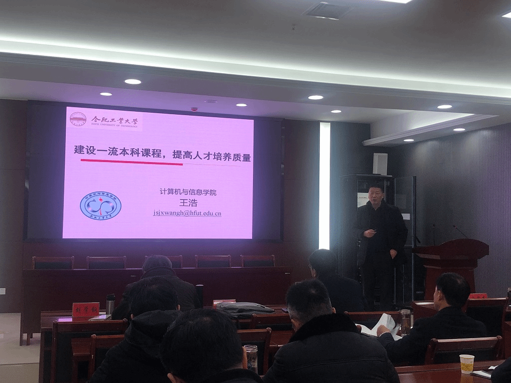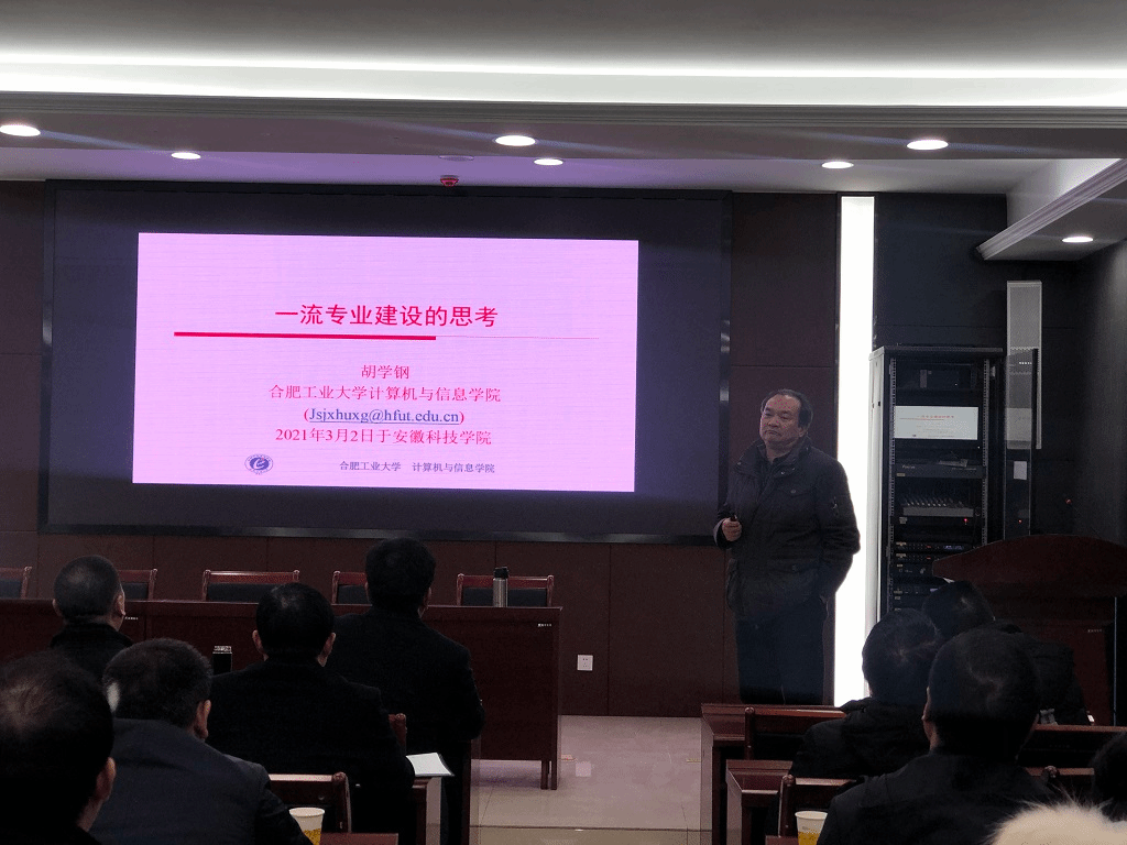 为深入推进一流专业与一流课程建设,3月2日下午,合肥工业大学胡学钢教授和王浩教授应邀来我校作“一流专业建设、一流课程建设、工程教育专业认证”专题报告,校教学督导组、各学院分管教学副院长、信息与网络工程学院全体教职工共同在龙湖校区西附楼111聆听了报告,报告由校党委委员、副校长黄友锐主持。