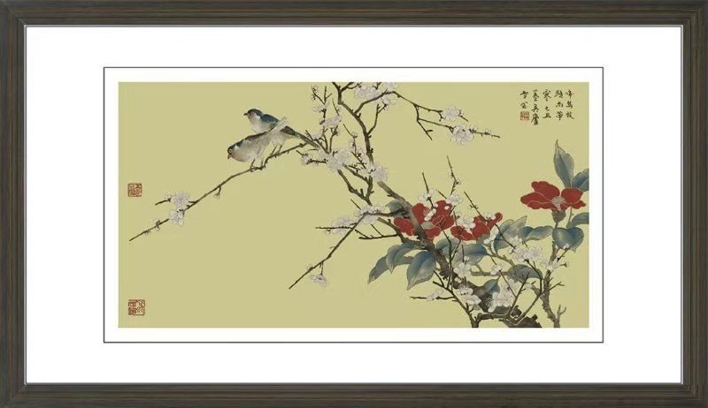 该云锦画名为《啼鸟寒枝》,画芯:63x33cm,外径:95x55x5cm,系著名美术教育家、画家陈之佛的写意花鸟。全画以梅花、山茶、小鸟三者为主体,清新隽逸,典丽华滋,寓意母校七十年办学,艰苦奋斗、砥砺奋进,不惧寒风、不畏冬雪;预示母校事业发展蒸蒸日上,一代代安科人以昂扬奋进的姿态开拓未来。