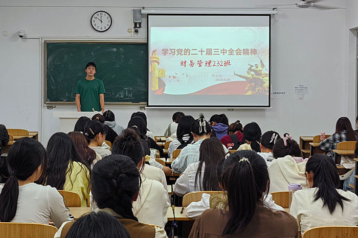 各团支部重点围绕《中国共产党第二十届中央委员会第三次全体会议公报》《中共中央关于进一步全面深化改革、推进中国式现代化的决定》等,带领团员一同读原文、悟原理,深入学习领会进一步全面深化改革的主题、指导思想、总目标、重大原则、重大举措和根本保证。在交流中,同学们积极讨论如何在新时代背景下继续弘扬党的优良传统,争做新时代有担当、有作为的青年。“党的二十届三中全会为国家未来的发展指明了方向,也为我们的成长提供了宝贵的指导,”会计学236班的孟逸飞同学分享道,“作为新时代的青年,我会立足专业,努力学习,强化风险防范意识,严守职业道德,为祖国经济发展护航。
