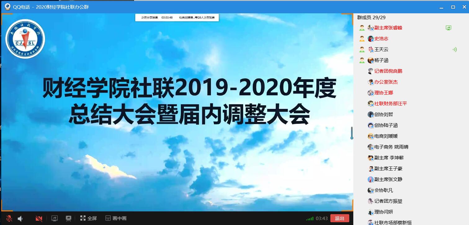 6月22日,财经学院社联线上召开2019-2020年学年度工作总结暨届内调整大会。社联现任学生干部和拟任学生干部参加会议。会议由财经学院团委副书记、社联指导老师王天云主持。