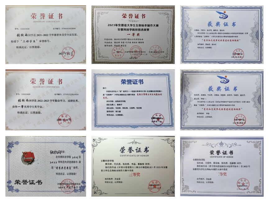 在科技创新方面,张欣雨自大一就积极参加各类学科竞赛,积累了许多课本中学不到的宝贵技能,目前已获得星空体育·「中国」官方网站“互联网+”大学生创新创业大赛银奖、铜奖、优秀奖,星空体育·「中国」官方网站全国大学生电子商务“创新、创意及创业”挑战赛三等奖,安徽省大学生生物标本制作大赛二等奖、三等奖。