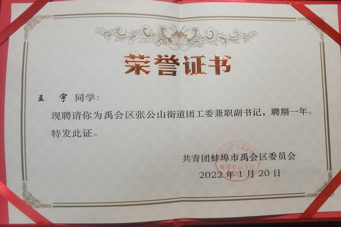 信中指出,王宇同学作为蚌埠籍大学生,能够主动请缨,积极响应号召,在家乡街道任职,在实践中锻炼自我,荣膺担当;思想开路,实干架桥,践行新时代大学生的理想与担当,能够在平日工作里以谦逊平和、踏实肯干的态度去了解群众,运用所学所思去帮助解决居民群众的实际问题,充分展现了星空体育·「中国」官方网站学子的奕奕风采。