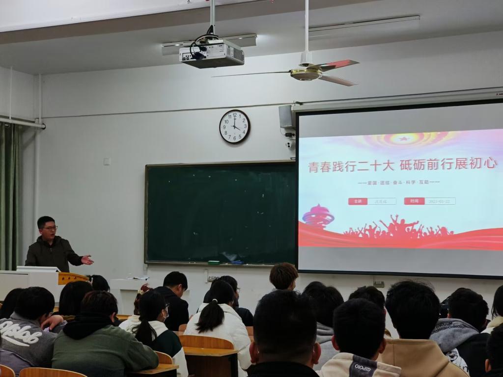 主题班会上,沈竞成以“青春践行二十大,砥砺前行展初心”为主题,分别从“弘扬爱国主义,勇担时代使命”、“发扬团结协作,凝聚发展伟力”、“传承奋斗精神,成就出彩人生”、“学习科学知识,武装精神世界”和“开启互助之路,感受爱的力量”五个部分结合同学们的学习和生活实际深入探讨了如何把握当下,争做有理想、敢担当、能吃苦、肯奋斗的新时代好青年,让青春在实践中绽放光彩。班会中,几名同学也分别从自身实际经历出发,分享了自己对班会主题的感受与观点,并表示会从此时此刻做起,从身边小事做起,立志成为胸有凌云志的有为青年。班会结束后,观摩团进行了点评,从主题思想、环节设计、ppt制作和案例讲解等方面给予了肯定,并给出了很多具有建设性的意见和建议。