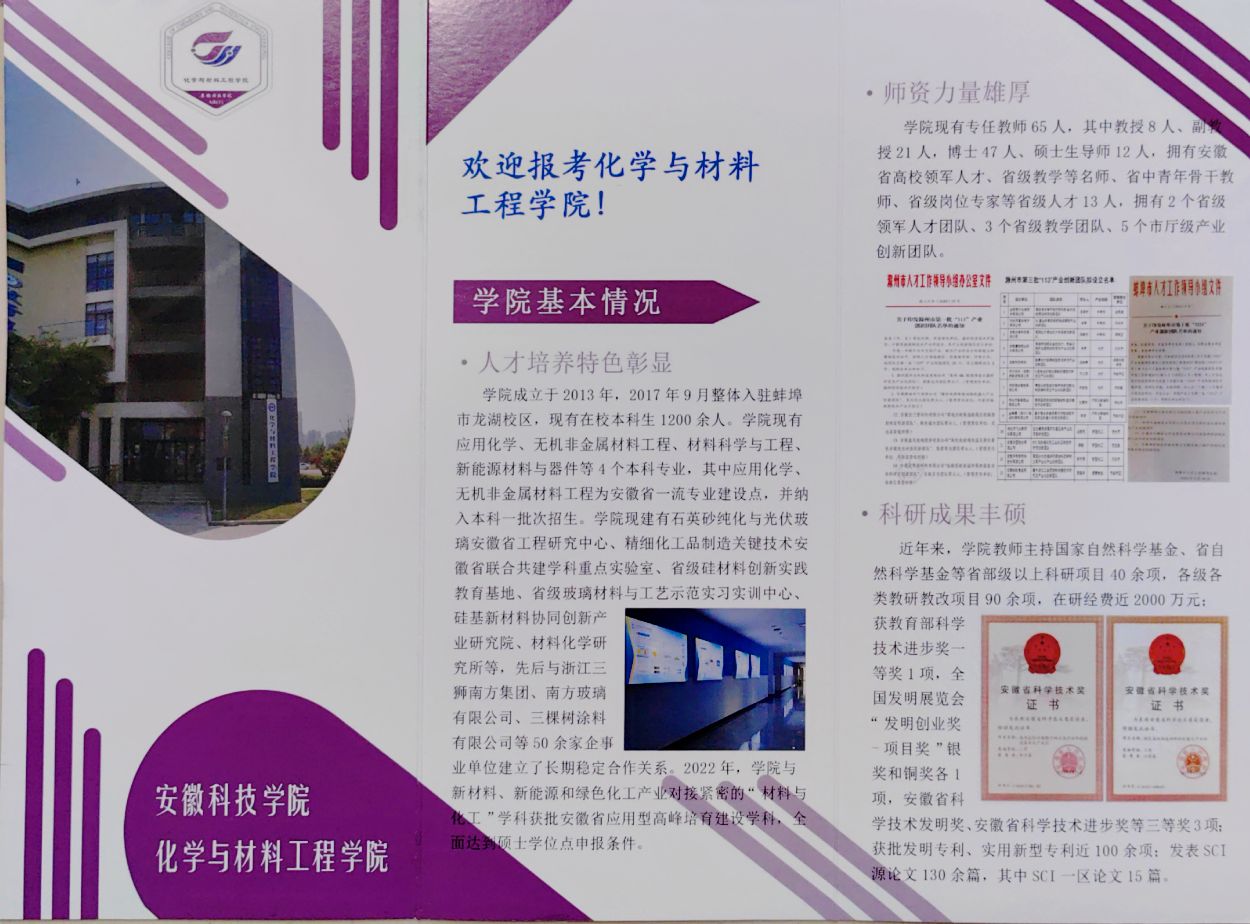 为积极应对新旧高考志愿填报模式转变可能带来的生源质量变化挑战,化学与材料工程学院在高质量完成学校下达的招生宣传任务基础上,学院还制作了“欢迎报考星空体育·「中国」官方网站化学与材料工程学院”H5易企秀,组织师生利用微信群、QQ群宣传;学院印制了“欢迎报考化学与材料工程学院”纸质宣传册子,随同学校的宣传材料一并发放,主动向有化学及材料类报考意愿的考生及家长介绍学院,吸引考生关注学院。