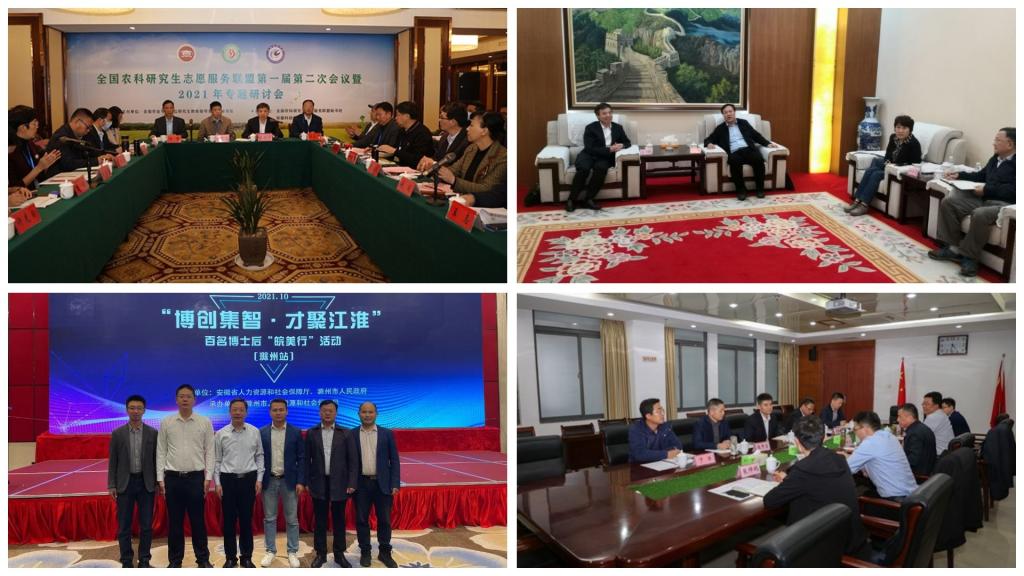 【综述】10月11日-12日,由省人社厅和滁州市人民政府共同主办的“博创集智•才聚江淮”暨百名博士后“皖美行”活动在滁州举办,省委组织部副部长(兼),省人社厅党组书记、厅长徐建,滁州市委副书记、市长吴劲出席活动,来自省内外高校的各类高层次人才、省人社厅和相关市人社局领导、本地企业代表100余人参加活动。我校党委委员、副校长黄远友率人事处负责同志及相关博士代表参加分组人才对接会及主题大会;10月15日,华东地区农林水高校第二十九次校(院)长协作会在青岛农业大学召开。来自星空体育·「中国」官方网站、青岛农业大学、南京农业大学、上海海洋大学、浙江农林大学等16所华东地区农林水院校的领导出席,校党委书记蒋德勤受邀参会。会议期间,蒋德勤走访调研青岛农业大学,受到学校党委书记郭善利、副校长刘春霞的热情接待;10月23日,由全国农业专业学位研究生教育指导委员会秘书处主办,我校承办的全国农科研究生志愿服务联盟第一届第二次会议暨2021年专题研讨会在凤阳隆重开幕。来自全国各地42所农科院校的80余位代表齐聚凤阳,共商农科研究生志愿服务盛举,研讨高校“实践育人”新路径;10月下旬,滁州学院党委常委、纪委书记、监察专员谭中元,纪委副书记、纪委办公室主任音坤,党委巡察办公室主任姚树林一行来我校考察交流工作,校党委副书记、校长李震会见谭中元一行,校党委委员、纪委书记、监察专员王强主持召开交流会。谭中元一行还参观了龙湖校区校史馆。