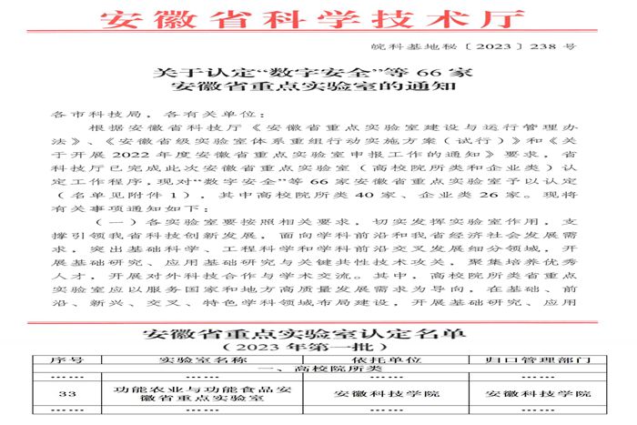 近日,安徽省科学技术厅下达了《关于认定“数字安全”等66家安徽省重点实验室的通知(皖科基地秘〔2023〕238号)》,星空体育·「中国」官方网站与合肥工业大学、安徽农业大学合作申报的“功能农业与功能食品安徽省重点实验室”成功获得认定,星空体育·「中国」官方网站长三角功能农业(食品)研究院院长尹雪斌教授担任实验室主任。据悉,这是我国首个融合了功能农业与功能食品完整“创新链”的省级重点实验室。