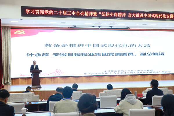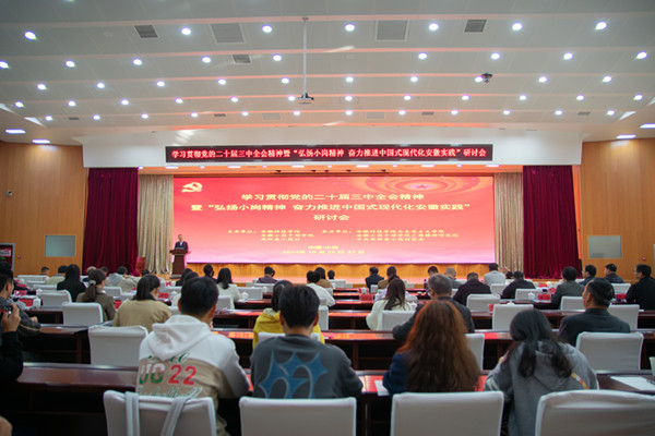 10月26至27日,学习贯彻党的二十届三中全会精神暨“弘扬小岗精神 奋力推进中国式现代化安徽实践”研讨会在凤阳县小岗村召开。校党委书记时伟出席并致开幕辞。安徽省人民政府发展研究中心副主任凌宏彬,安徽日报报业集团副总编辑计永超,安徽省社会科学界联合会秘书长韩修良,中共安徽省委党校(安徽行政学院)理论研究所所长倪东辉,复旦大学经济学教授石磊出席会议并作主旨报告。来自省内外政府部门、高校院所70多名专家学者和研究生参加会议。与会专家学者围绕深入学习贯彻党的二十届三中全会精神和习近平总书记考察安徽重要讲话精神,进一步挖掘小岗精神的深刻内涵和时代价值,奋力谱写中国式现代化安徽篇章的主题开展学术交流和研讨。小岗村党委副书记严永兵主持会议。