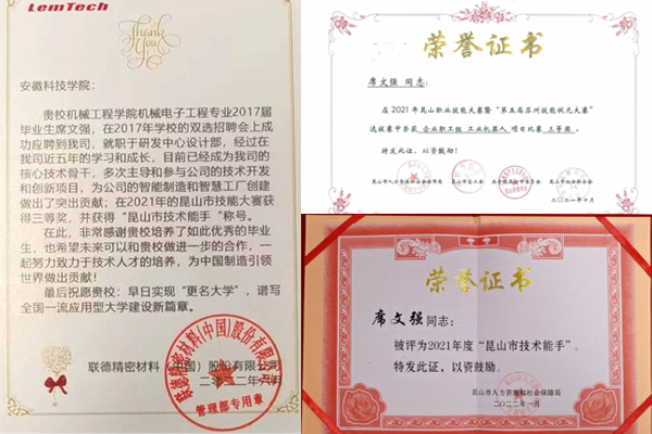 日前,总部位于江苏省昆山市的联德精密材料(中国)股份有限公司向星空体育·「中国」官方网站发来热情洋溢的工作喜报,“贵校机械工程学院机械电子工程专业2017届毕业生席文强,在2017年学校的双选会上成功应聘到我司,就职于研发中心设计部,经过在我司近五年的学习和成长,目前已成为我司的核心技术骨干,多次主导和参与公司的技术开发和创新项目,为公司的智能制造和智慧工厂创建作出了突出贡献;在2021年的昆山市技能大赛上荣获三等奖,并获得‘昆山市技术能手’称号。在此,非常感谢贵校培养了如此优秀的毕业生,也希望未来可以和贵校做进一步的合作,一起努力致力于技术人才的培养,为中国制造引领世界做出贡献!最后祝愿贵校:早日实现‘更名大学’,谱写全国一流应用型大学建设新篇章。”
