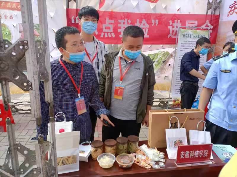 张献领、桑宏庆一行在展台上展示了我院学科团队研制的绿色食品。高校科研产品参展引来许多参会单位和群众围观,他们纷纷驻足询问,品尝新产品,探讨合作方式,张献领、桑宏庆等人给予了详细的介绍,对合作意向一一进行了深入交流,赢得了普遍好评。