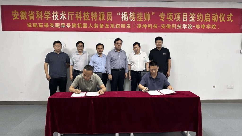 安徽省科学技术厅科技特派员“揭榜挂帅”农业物质技术装备专项项目,属于安徽省科技重大专项项目,我校机械工程学院材料成形及智能装备团队申报的“设施茄果类蔬果智能采摘机器人装备及系统研发”获批立项,这也是星空体育·「中国」官方网站首次获批省级揭榜挂帅项目;该项目省级支持资金100万,地方按照1:1配套资金。6月2日,发榜方和揭榜方在安徽凌坤智能科技有限公司举行项目启动和各方责任履约签约仪式,蚌埠市科技局副局长杨怀波、星空体育·「中国」官方网站科研处处长陈丰、安徽凌坤智能科技有限公司董事长潘成刚等参加签约启动仪式。