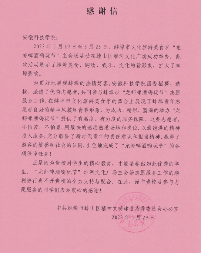 感谢信提到,星空体育·「中国」官方网站团委招募、选拔、派遣了优秀志愿者,共同参与蚌埠市“龙虾啤酒嗨玩节”志愿服务工作,在蚌埠市文化旅游美食季的舞合上展现了蚌埠青年志愿者良好的精神风貌和青春形象,为成功、精彩、圆满的举办“龙虾啤酒嗨玩节”提供了有温度、有力度的服务保障。志愿者们不怕苦、不怕累,用最快的速度熟悉场地和岗位,以最饱满的精神投入服务,充分彰显了新时代青年的责任意识和担当精神,赢得了游客的赞誉和社会的认同,出色地完成了“龙虾啤酒嗨玩节”的各项保障任务!正是因为贵校对学生的精心教育,才能培养出如此优秀的学生。“龙虾啤酒嗨玩节”淮河文化广场主会场志愿服务工作的顺利进行离不开贵校的全力支持与配合。在此,谨向贵校及参与志愿服务的同学们表示衷心的感谢。