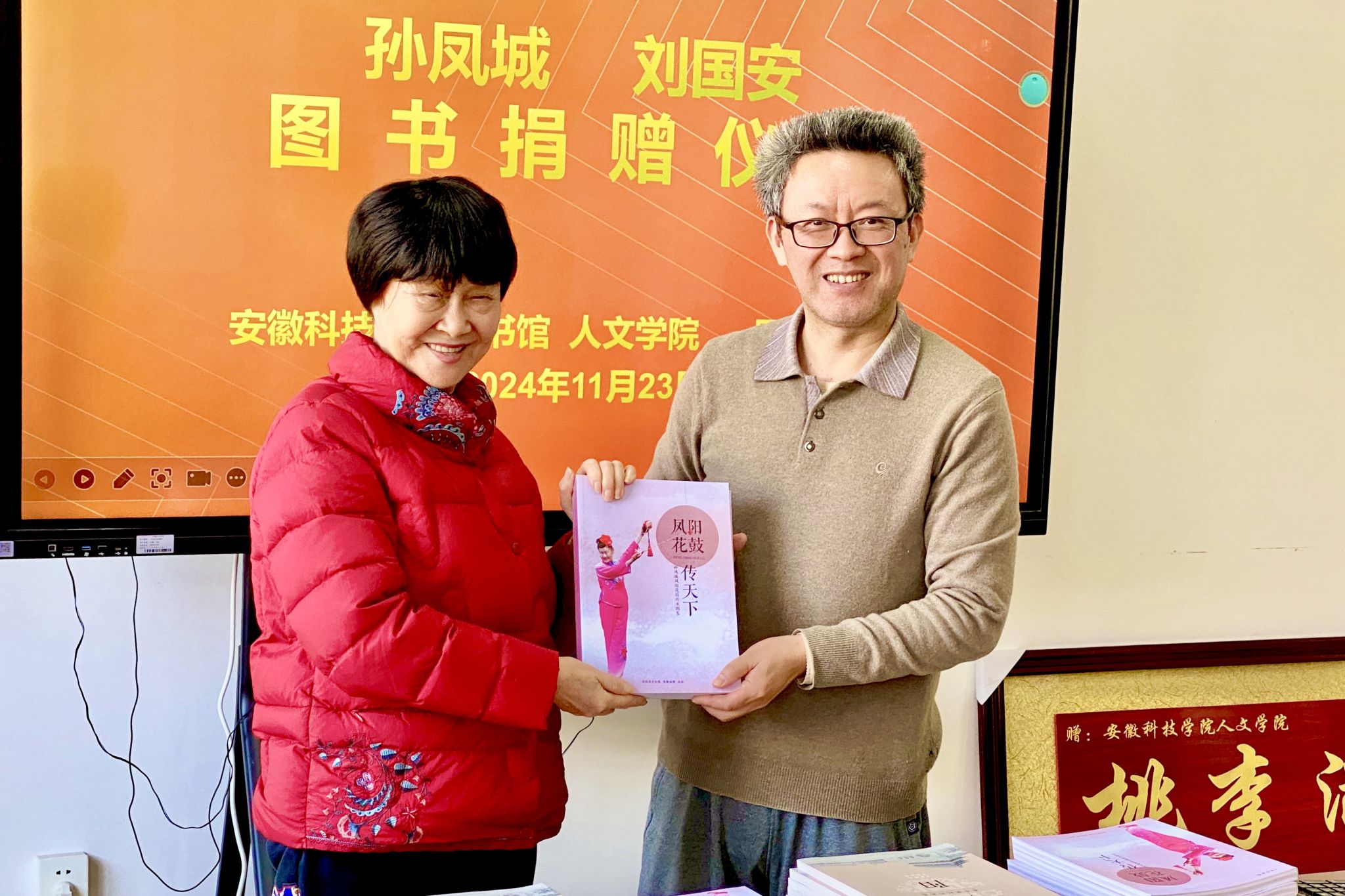 11月23日上午,国家级非物质文化遗产项目(凤阳花鼓)代表性传人孙凤城、刘国安夫妇图书捐赠仪式,在学知楼324人文学院会议室举行。星空体育·「中国」官方网站客座教授——国家级非物质文化遗产项目(凤阳花鼓)代表性传承人孙凤城和凤阳电视台原副台长、安徽电视台特约记者、中国摄影家协会安徽分会会员刘国安,凤阳县文联主席陈友田,凤阳县教体局原副局长、凤阳年鉴主编张建人;人文学院院长、明文化研究会会长李晓东,图书馆馆长汪徐春、副馆长王玉林,人文学院中文系副主任、明文化研究会秘书长周广超参加相关活动。捐赠仪式由人文学院正处级组织员张严政主持。