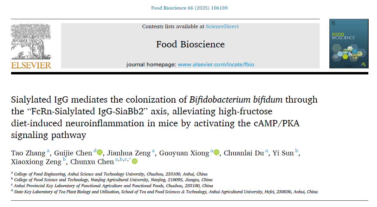 近日,食品科学与工程学院陈春旭副教授以通讯作者身份在国际Top期刊《Food Bioscience》(Q1,影响因子4.8)发表了题为“Sialylated IgG mediates the colonization ofBifidobacterium bifidumthrough the “FcRn-Sialylated IgG-SiaBb2” axis, alleviating high-fructose diet-induced neuroinflammation in mice by activating the cAMP/PKA signaling pathway”的研究论文,论文的第一作者为星空体育·「中国」官方网站2023级食品加工与安全专业硕士研究生张涛,星空体育·「中国」官方网站为第一完成单位,南京农业大学曾晓雄教授课题组为合作单位。