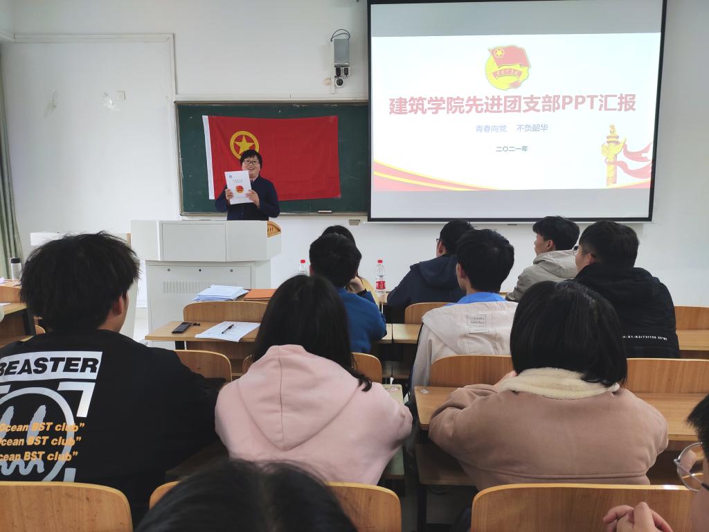 为汲取党史学习教育进程中力量,推动学院共青团工作再上新台阶,3月31日,建筑学院在致知楼A208教室举办“青春向党 不负韶华”主题团日活动,开展先进团支部汇报,展现青春风采。建筑学院党委副书记谢宜勤、团委书记沈德艳、辅导员阮怀思、团委兼职副书记李建华和素质扩展部部长单新海出席并担任评委,非毕业班全体团支部书记参加。