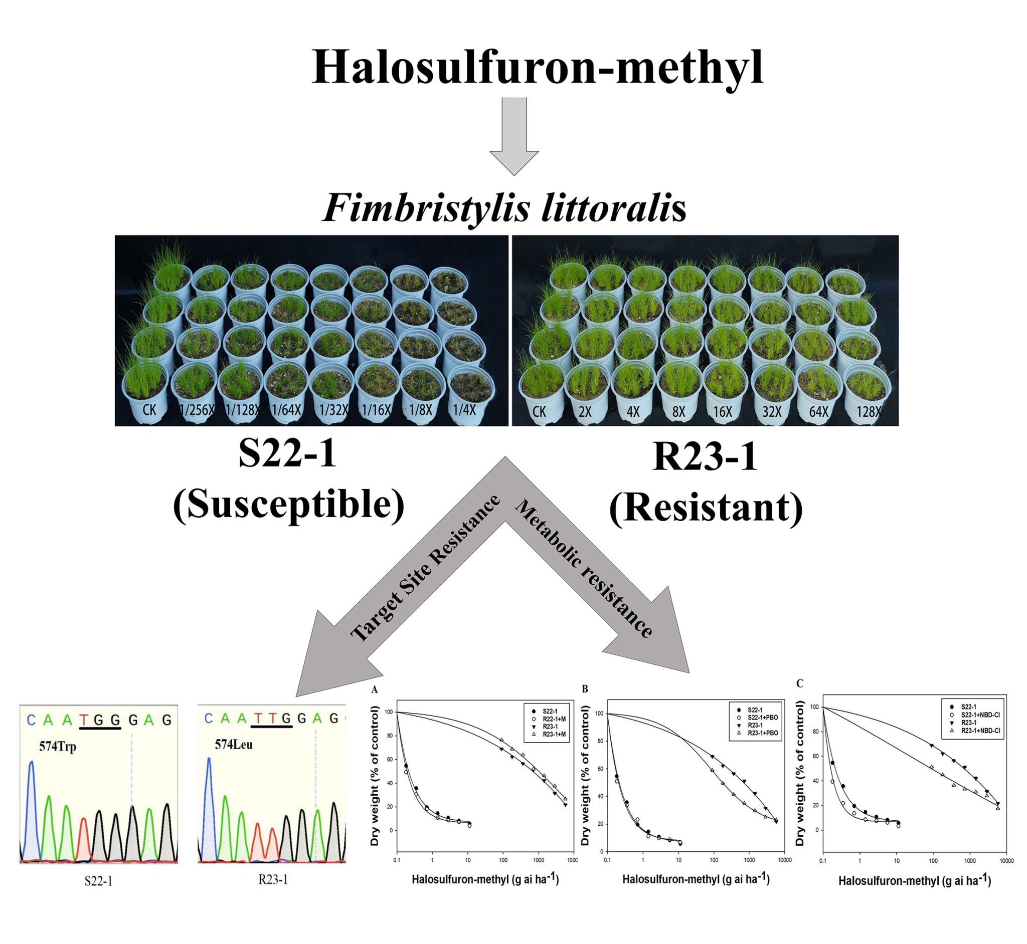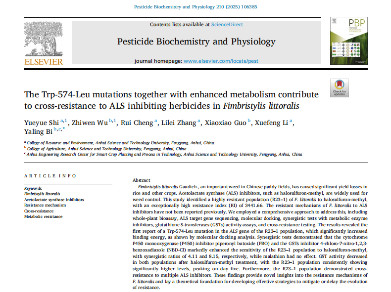 近日,我校农学院毕亚玲教授团队在国际知名期刊《Pesticide Biochemistry and Physiology》(中科院一区Top期刊,IF=4.2)发表了题为“The Trp-574-Leu mutations together with enhanced metabolism contribute to cross-resistance to ALS inhibiting herbicides inFimbristylis littoralis”的研究论文。该研究首次揭示了稻田恶性杂草水虱草(Fimbristylis littoralis Gaudich.)对乙酰乳酸合成酶(ALS)抑制剂类除草剂的抗性机制。硕士研究生史悦悦和青年教师吴志文博士为共同第一作者,毕亚玲教授为通讯作者,星空体育·「中国」官方网站为唯一完成单位。