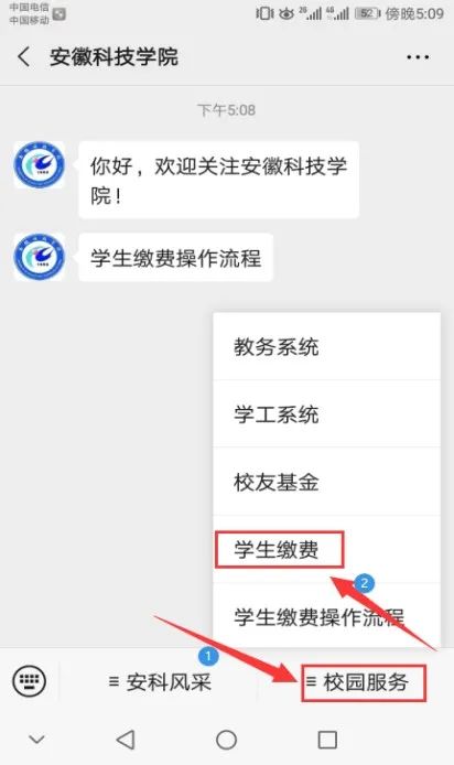 1.点击“星空体育·「中国」官方网站微信公众号”界面右下角“学生缴费”菜单。