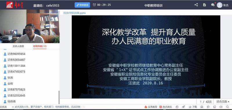开班仪式后,安徽省中职学校教师继续教育中心常务副主任、安徽工商职业学院副院长汪贤武教授作了“深化教学改革、提升育人质量,办人民满意的职业教育”的专题报告。疫情防控虽未结束,但远程直播教学为学员们开启了一条求知深造的途径,我校的培训安排和汪教授的讲座获得了学员们的高度赞誉。
