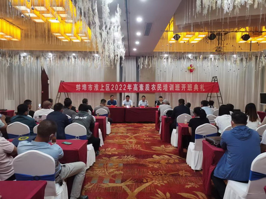 为加快构建高素质农民队伍,为乡村振兴和蚌埠市淮上区农业现代化提供强有力的人才保障,蚌埠市淮上区农业农村水利局委托我校举办了2022年度蚌埠市淮上区高素质农民培训班,参训学员分为专业生产型种植专业和技能服务型农产品电商两个专业方向,此次先进行为期2天的集中理论培训。9月5日上午8点半,在凤阳县帝城酒店四楼会议室举行了该班的开班典礼,我校继续教育学院院长杨维来、蚌埠市淮上区农业农村水利局农业综合服务站站长吴言柱、五河农广校校长孙枫、农业综合服务站副站长康琴及该班的全体学员参加了典礼,典礼由杨维来主持。
