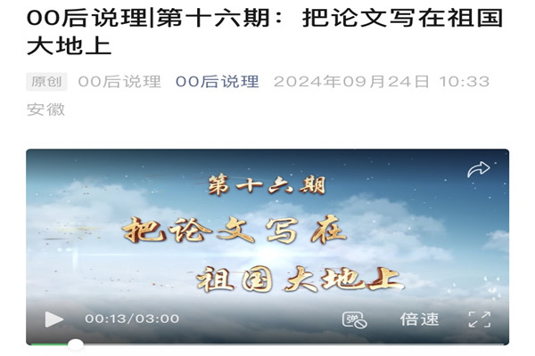 9月24日,由我校师生创作的《把论文写在祖国大地上》视频作品在安徽日报《00后说理》微信公众号精彩呈现。《把论文写在祖国大地上》作品由马克思主义学院教师把安丹、宇萍和赵仁青共同策划,管理学院、资源与环境学院研究生汤佳慧、荚长乐和陈春明参与拍摄制作。作品以00后大学生视角切入,讲述了我校师生用心擦亮农科底色,用力描绘乡村振兴的生动实践。