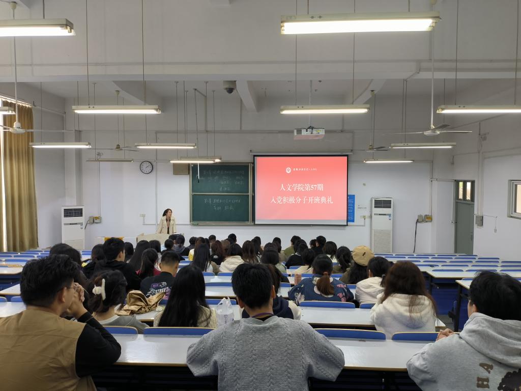 为加强入党积极分子的党性修养,学习贯彻落实党的二十大精神,引导广大青年学子以实际行动永远跟党走、奋进新征程,人文学院分党校于11月5日下午于求A106教室举行入党积极分子开班典礼。人文学院党委副书记、纪委书记李沙娜、法学专业学生党支部书记方明旺,第57期入党积极分子50余人参加了开班仪式。