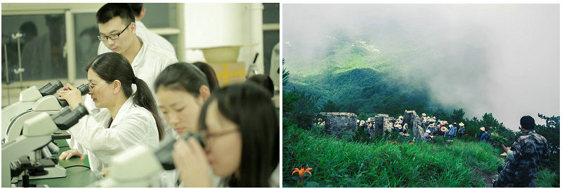 本专业现有生命与健康科学研究院、药学综合实验中心、中药标本中心、中药科技园(省级和校级实验实训中心),滁州道地药材研究所等校内教学实践基地。生命与健康科学研究院,拥有液质联用、PCR仪等先进仪器设备;药学综合实验中心下设中药化学实验室、中药炮制学实验室、室药理毒理实验室、微生物实验室、中药制剂实验室、中药学室、药用植物组培室、中药材资源普查室等,实验室面积910m2,实验室固定资产达到464余万元,满足校内专业实验实践课程开展要求;中药标本中心,拥有腊叶标本数量近100000份;中药科技园占地20亩,栽培品种达200余种。此外,校外实验实训基地5个,校内外教育实习基地10余个,与岳西鹞落坪国家自然保护区(右图:野外实习)、亳州中药材商品交易中心、安徽九洲方圆制药有限公司、安徽协和成饮片有限公司等建立了长期稳定的产学研合作基地,借助企业平台,通过项目合作助推人才培养。